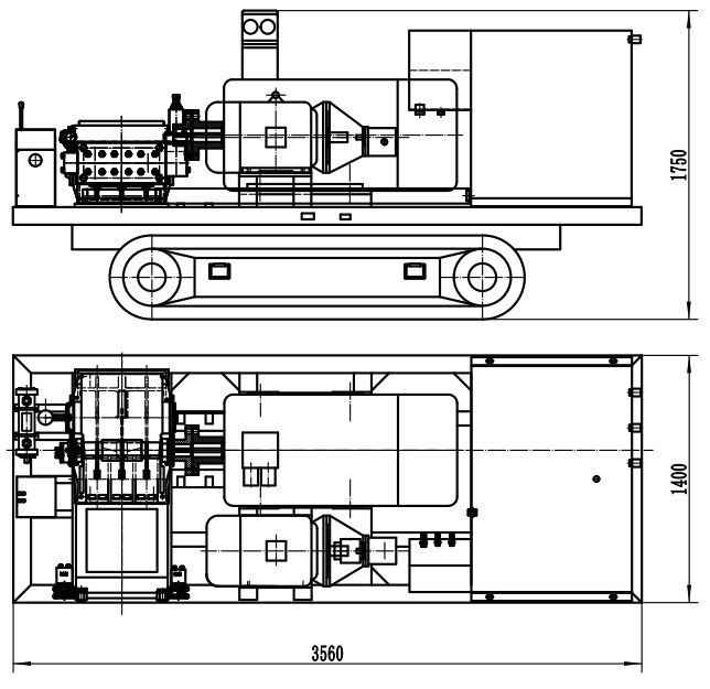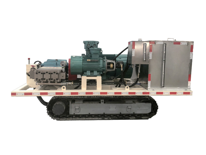 注水泵站采用我公司注水泵安標產品,配置履帶式行走機構,適應礦井巷道內移動使用,行走機構采用單獨設置的液壓 油泵,通過換向閥驅動液壓馬達,實現機組的前后移動和轉彎,并具有一定的爬坡能力,機組配有過渡水箱和液壓油箱。